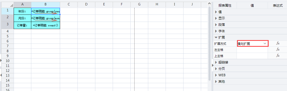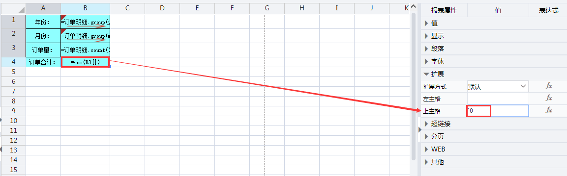 选中B4单元格,展开报表属性栏中的【扩展】,把B4的上主格设为 `0,这样可以使B4单元格汇总的,是B1扩展出来的所有年份的订单合计。