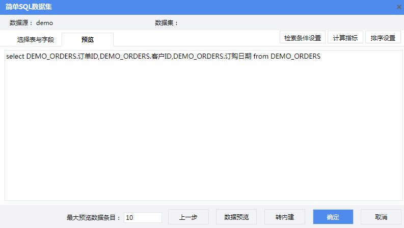 子报表中的数据集“订单明细”是从产品自带演示数据库的“演示 _ 订单表”取数,数据集sql语法如下: