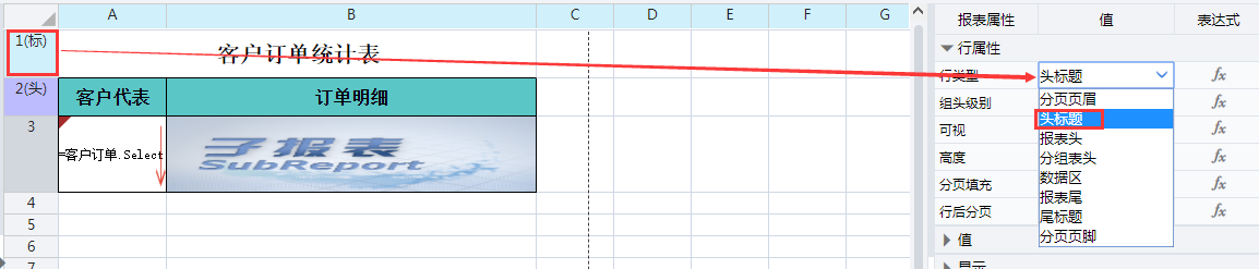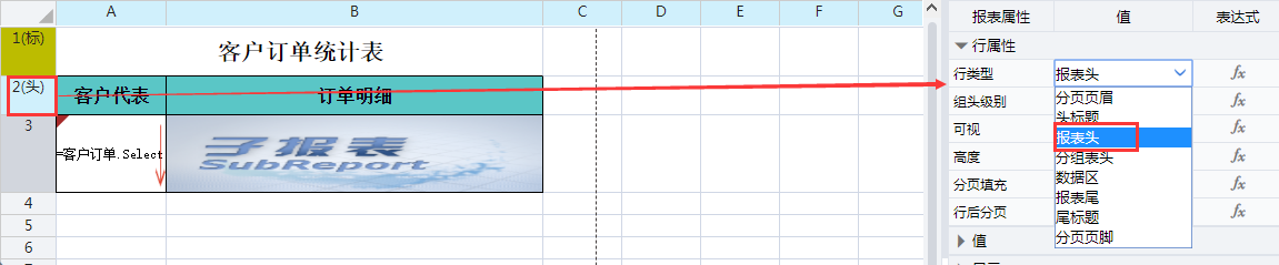 选中第二行,将【行类型】设置为报表头。