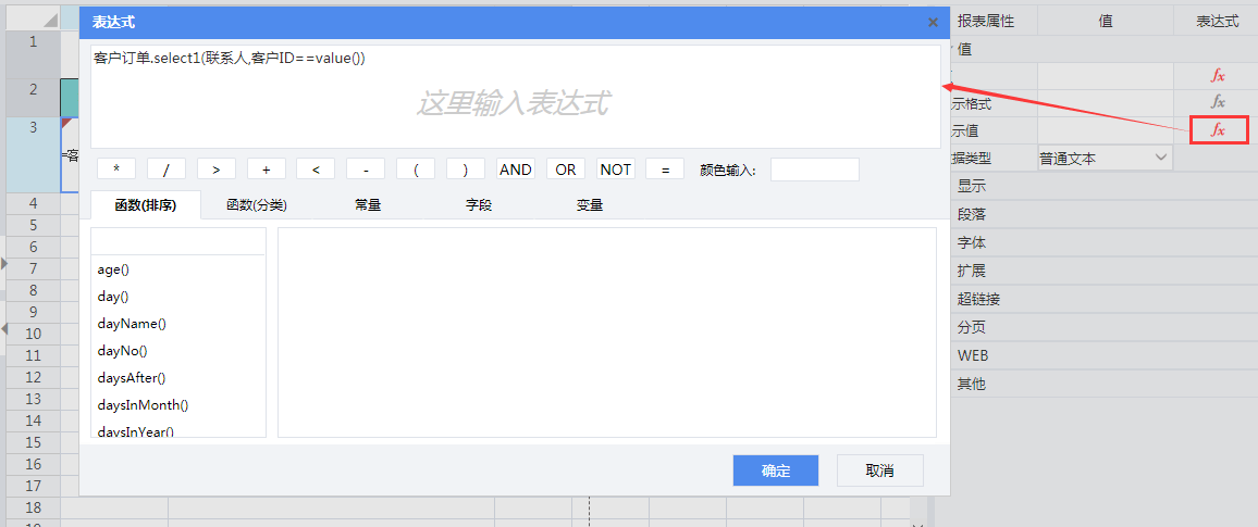 选中A3单元格,在报表属性栏的【显示值】中设置表达式:客户订单.select1(联系人,客户ID==value())