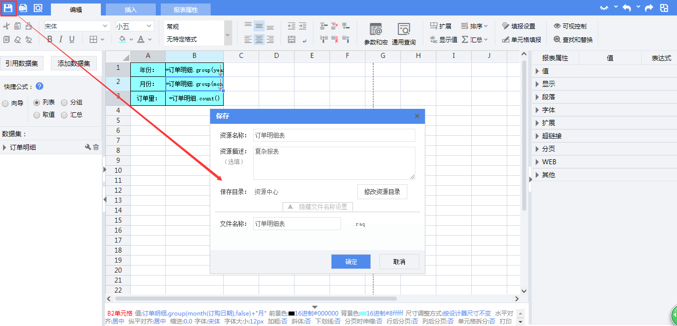 点击【保存】按钮,再弹出的保存页面设置资源名称、文件名称均为“订单明细表”。