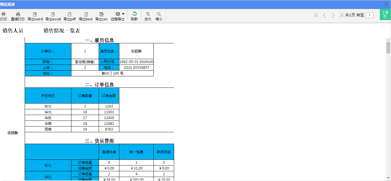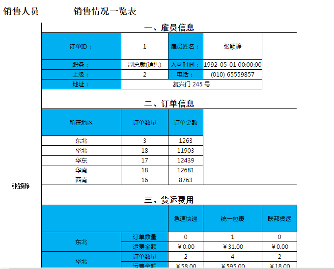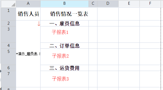 制作“销售情况一览表”,引用“雇员信息表”、“订单信息表”和“货运费用表”三个子报表。