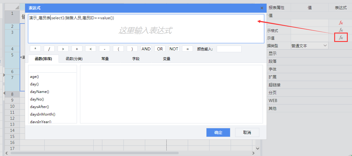 选中A2单元格,设置显示值为:=演示_雇员表.select1(销售人员,雇员ID==value())