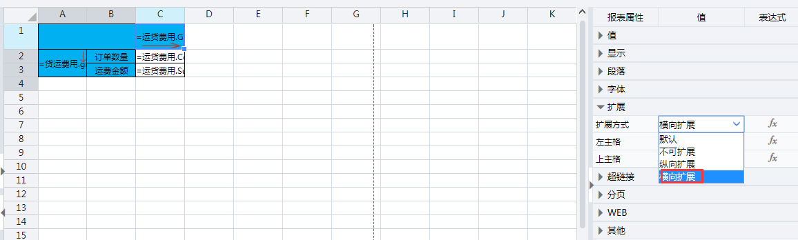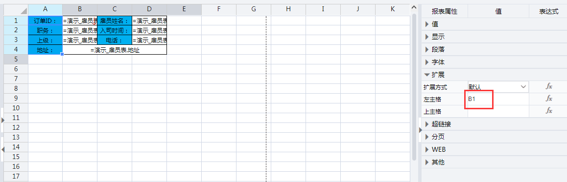 引入式子报表的特点是,主报表单元格根据子报表的行数列数,双向同时扩展,子报表有几行几列,主报表中就扩展出几行几列。子报表占用主报表的空白行列,格线严格对齐,引入式子报表在展现、导出和打印时为表格。