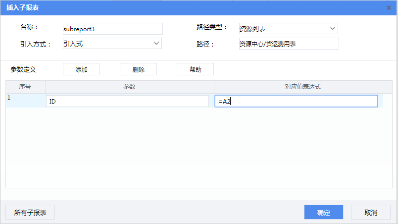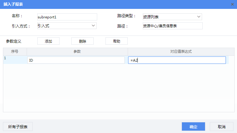 1)选中B3单元格,点击菜单栏【插入】-【子报表】,将“引入方式”设为“引入式”,“路径”选择子报表“雇员信息表”。然后点击参数定义后的【添加】按钮添加参数,对应值表达式为:=A2,设置完成点【确定】按钮。