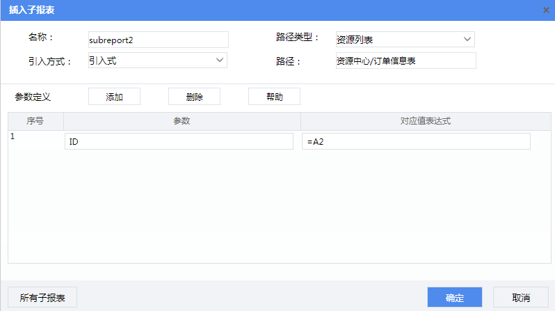 2)选中B5单元格,点击菜单栏【插入】-【子报表】,将“引入方式”设为“引入式”,“路径”选择子报表“订单信息表”。然后点击参数定义后的【添加】按钮添加参数,对应值表达式为:=A2,设置完成点【确定】按钮。