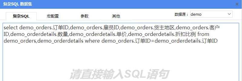 新建复杂SQL数据集“客户信息”,SQL语句:select demo_orders.订单ID,demo_orders.雇员ID,demo_orders.货主地区,demo_orders.客户ID,demo_orderdetails.数量,demo_orderdetails.单价,demo_orderdetails.折扣比例 from demo_orders,demo_orderdetails where demo_orders.订单ID=demo_orderdetails.订单ID