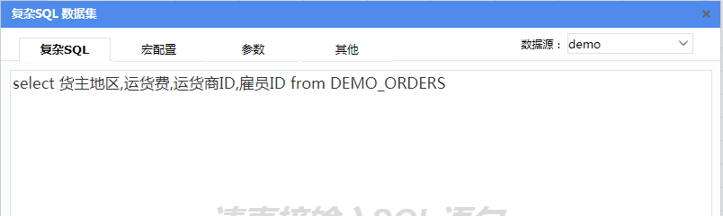 新建复杂SQL数据集“货运费用”,SQL语句: select 货主地区,运货费,运货商ID,雇员ID from DEMO_ORDERS
