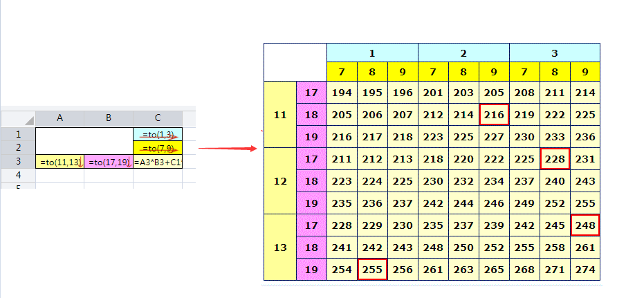 例2:下图的报表中,C3[A3:1,B3:2;C1:2,C2:3]的返回值为216;C3[A3:3,B3:3;C1:1,C2:2]的返回值为255;C3[A3:2,B3:1;C1:3,C2:2]的返回值为228;C3[A3:3,B3:1;C1:3,C2:3]的返回值为248。
