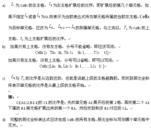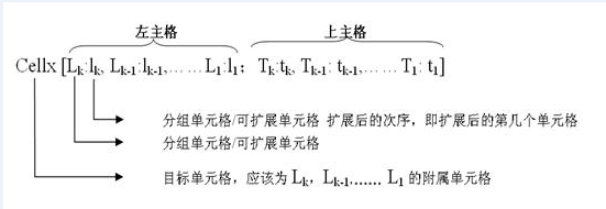 在上述的层次坐标的表示法中,如果目标单元格Cellx本身是扩展单元格,那么要唯一描述(精确定位)其扩展后的单元格的位置,可以写为Cellx[Lk:lk,Lk-1:lk-1...L1:l1,Cellx:n],其中n为Cellx扩展后的次序。与之类似,如果Cellx只有上主格,可以写为Cellx[;Tk:tk,Tk-1:tk-1...T1:t1,Cellx:n]。