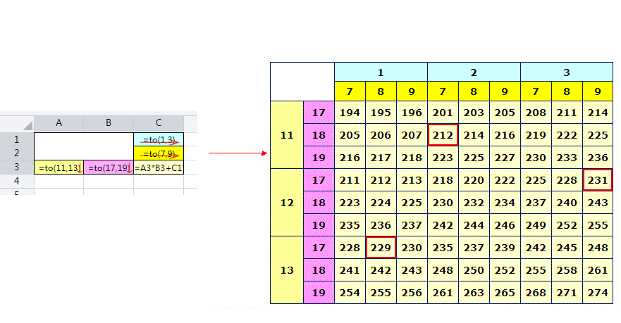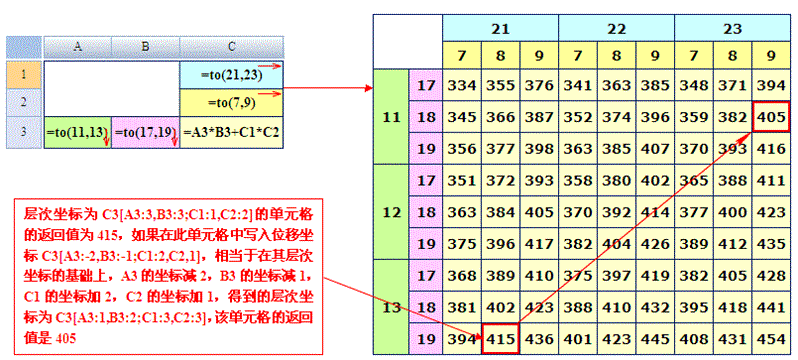 例3:下图的报表中,C3[A3:1,B3:2;C1:2]的返回值为212;C3[A3:3;C1:1,C2:2]的返回值为229;C3[A3:2;C1:3,C2:3]的返回值为231。