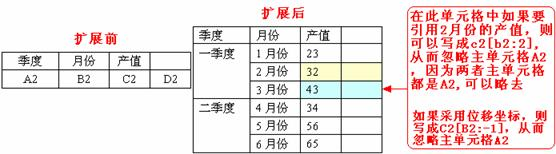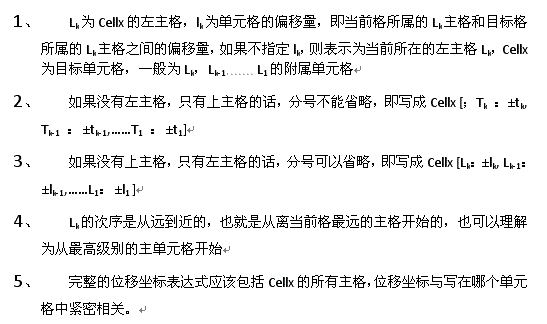 如果目标单元格与当前格的关系满足缺省主格认定规则,那么直接遵循缺省引用规则的表示法,不需要层次坐标/位移坐标。