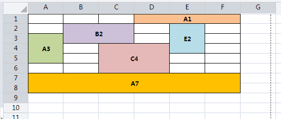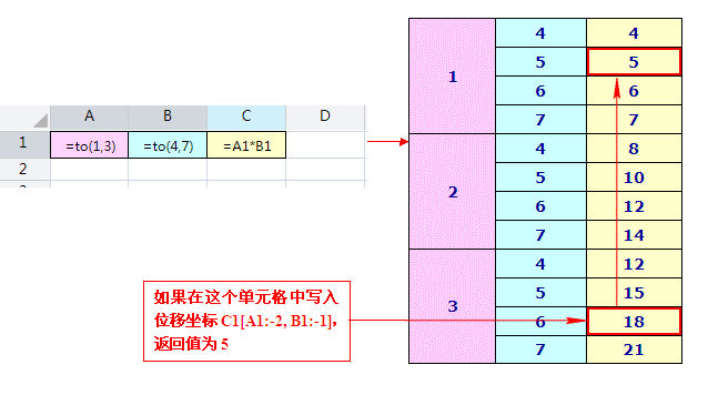 对于该主格,C1[A1:3,B1:2]表示对应的附属格,即图中黄色单元格。