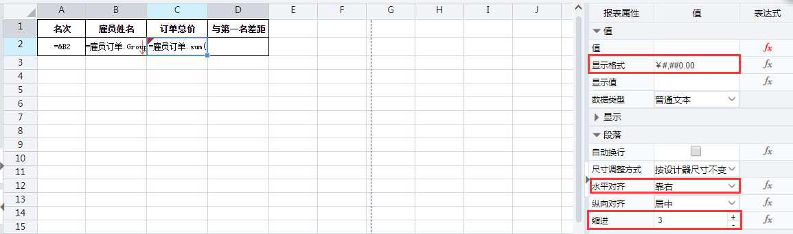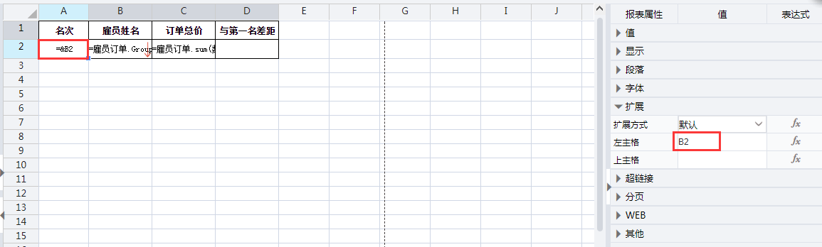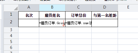 B2单元格表达式:=雇员订单.Group(销售人员,false,,,雇员订单.sum(数量*单价),true)
