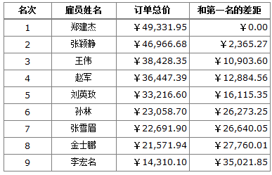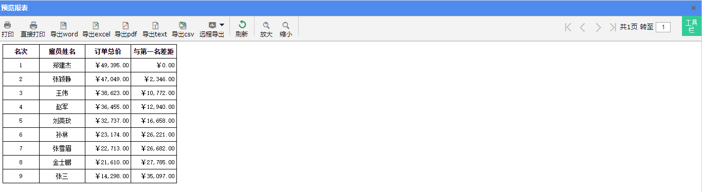 在这个报表中,按照销售额从大到小排列。和第一名的差距这个指标的运算逻辑是:第一名的销售额 - 当前销售的销售额。接下来,我们通过一个很简单的网格式报表,来了解与第一名差距的运算。