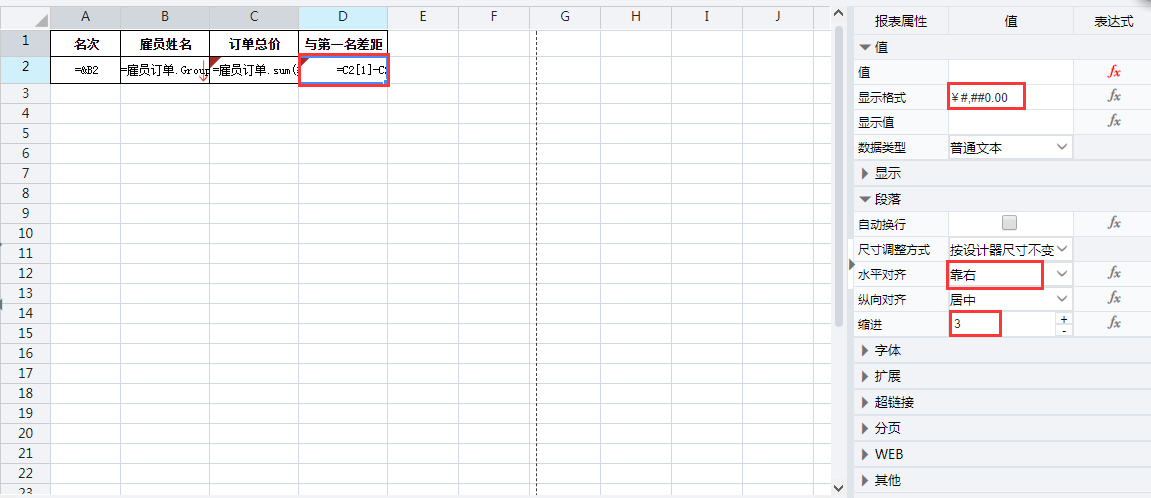 D2格的表达式最关键的在于如何表达出“第一名的销售额”,该报表是按照销售额从大到小排列的,因此第一名的销售额肯定是第一个C2格。如何在报表扩展前在表达式中描述出扩展后的第N个C2格呢? 这里用到了层次坐标,我们把D2单元格的表达式写成:=C2[1]-C2