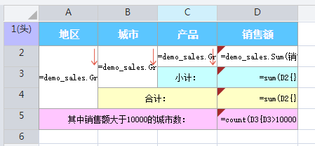 函数说明:该表达式的意思是统计D3扩展出来的列中大于10000的值的个数,即统计销售额高于10000元的城市数。 其中D3{D3>10000}表示D3单元格扩展出来的列中,大于10000的值。{D3>10000},{}里面是筛选条件,D3大于10000的值。
