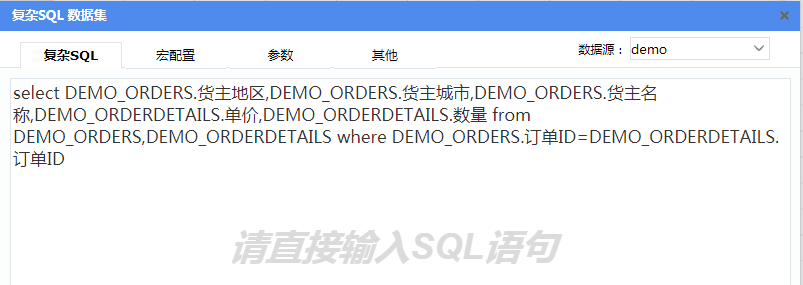 新建复杂SQL数据集“订单统计”,SQL语句为:select DEMO_ORDERS.货主地区,DEMO_ORDERS.货主城市,DEMO_ORDERS.货主名称,DEMO_ORDERDETAILS.单价,DEMO_ORDERDETAILS.数量 from DEMO_ORDERS,DEMO_ORDERDETAILS where DEMO_ORDERS.订单ID=DEMO_ORDERDETAILS.订单ID