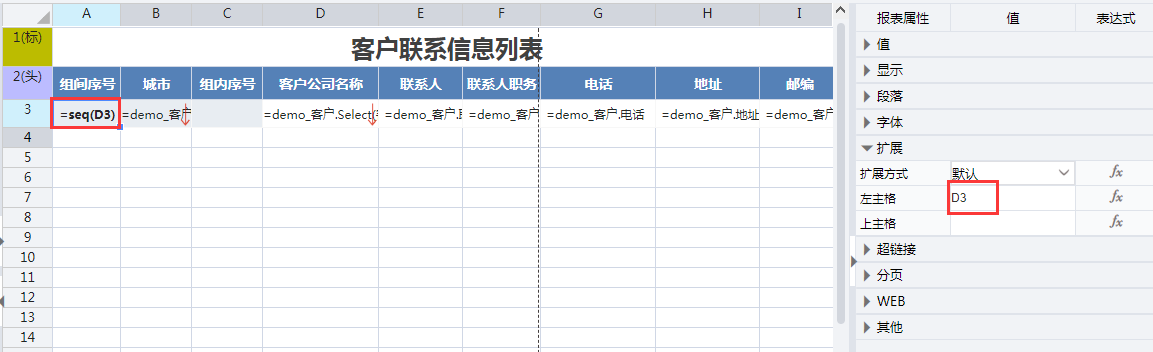 对于网格式报表即数据设置是列表显示的,可以直接在单元格中填写=seq()或者=&cell,然后设置下该单元格的左主格即可。