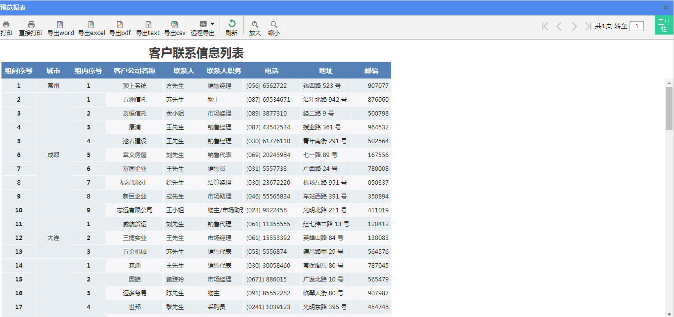 绘制出报表标题、列表头、以及按城市分组显示各城市下的客户公司名称等客户信息。