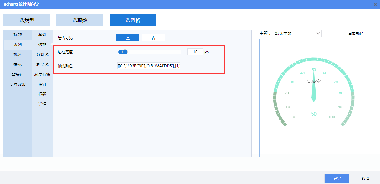 边框:设置边框宽度为10,并自定义轴线颜色 [[0.2,'#93BC9E'],[0.8,'#8AEDD5'],[1,'#A6D7C2']]。