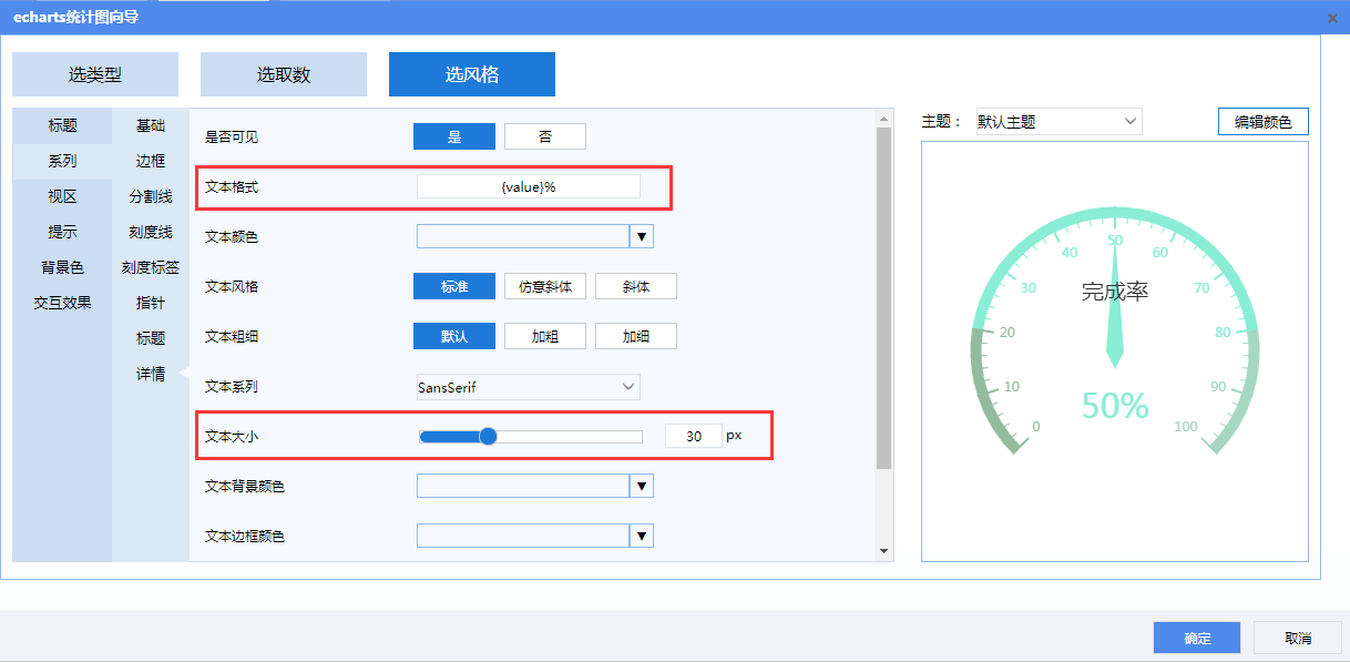 详情:设置文本格式为{value}%,文本大小为30。