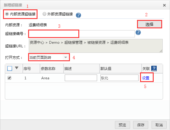 内部资源超链接,是使用当前系统中已有的资源(例如报表文件)建立超链接,使用时只需引用即可。