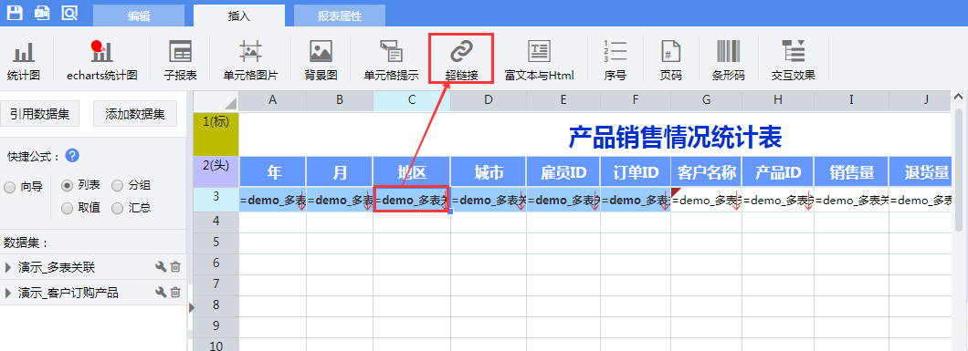 打开第一步中新建的“产品销售情况统计”报表,选中C3单元格,点击【插入】-【超链接】。