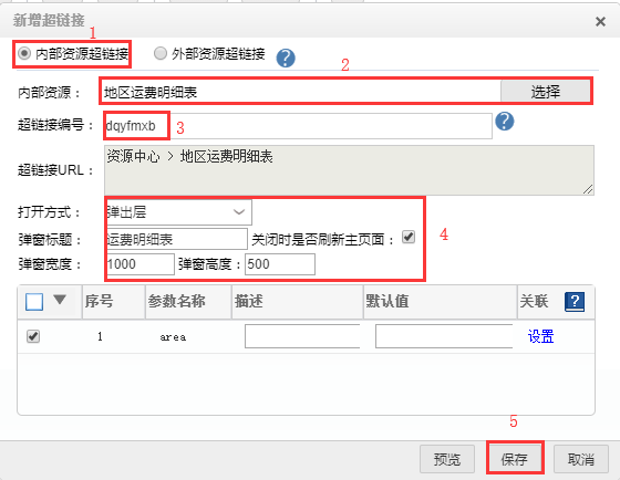 在新增超链接页面点击内部资源超链接-选择刚刚新建的“地区运费明细表”,超链接会自动获取该资源中的area参数的信息显示在参数列表中。输入超链接编号,打开方式设置为“弹出层”,并设置弹窗标题、宽高,勾选关闭时是否刷新主页面。设置完成后点保存即可。