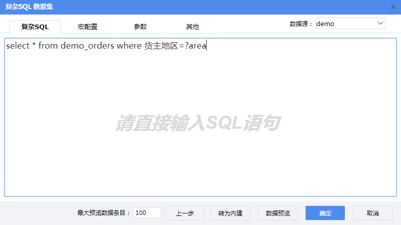 新建带有参数的复杂SQL数据集,SQL语句为:select * from demo_orders where 货主地区=?area