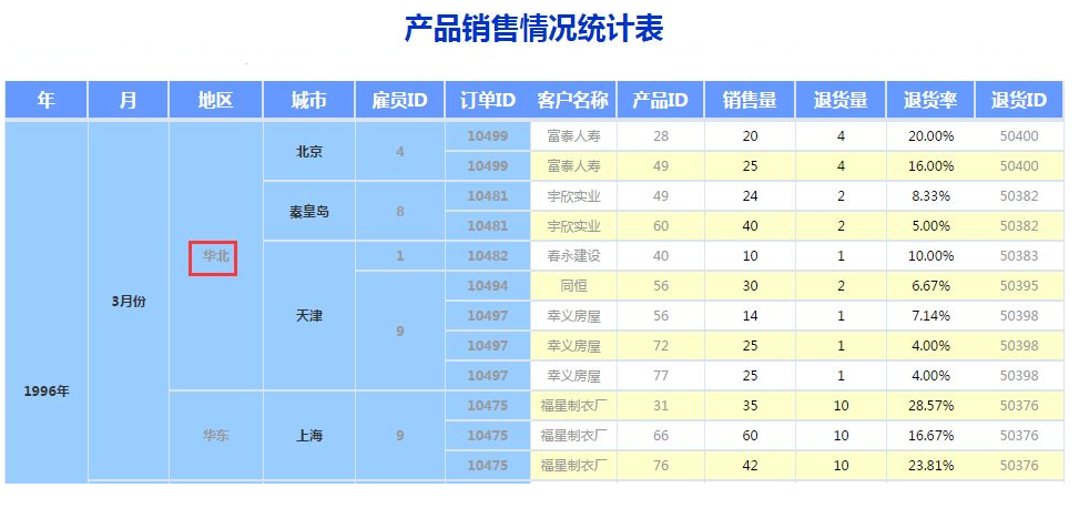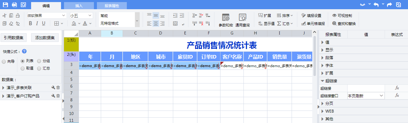 取数表达式如下: A3单元格的表达式:=demo多表关联.Group(year(订购日期),false)+'年' B3单元格的表达式:=demo多表关联.Group(month(订购日期),false)+'月份' C3单元格的表达式:=demo多表关联.Group(货主地区,false) D3单元格的表达式:=demo多表关联.Group(货主城市,false) E3单元格的表达式:=demo多表关联.Group(雇员ID,false) F3单元格的表达式:=demo多表关联.Select(订单ID) G3单元格的表达式:=demo多表关联.select(客户ID,false) H3单元格的表达式:=demo多表关联.Select(产品ID) I3单元格的表达式:=demo多表关联.数量 J3单元格的表达式:=demo多表关联.退货数量 K3单元格的表达式:=J3/I3 L3单元格的表达式:=demo_多表关联.Select(退货ID)