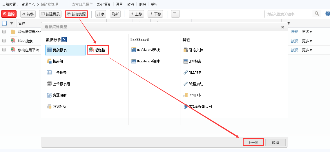 在资源中心-超链接管理目录下点击【新建资源】--【超链接】,点击【下一步】