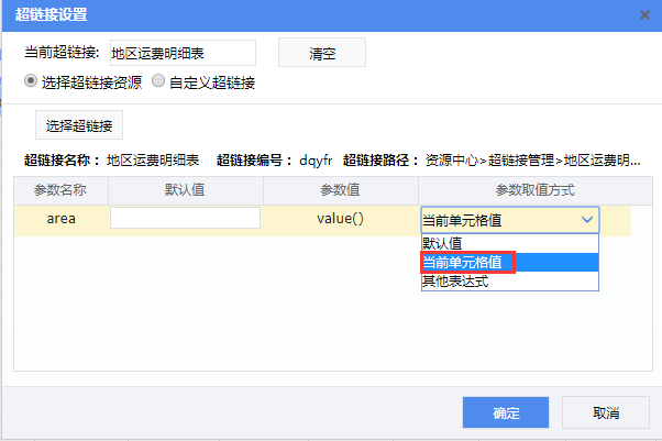 选择超链接后会自动显示出之前的超链接参数,此时点击参数取值方式栏的下拉列表,选择“当前单元格值”选项,点击【确定】。
