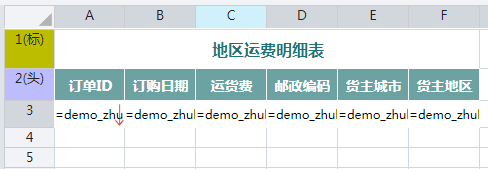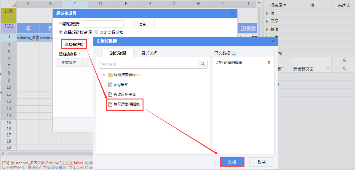 A1单元格表达式:=@area+"地区运费明细表",引入了参数用于获取链接报表中传过来的参数值。