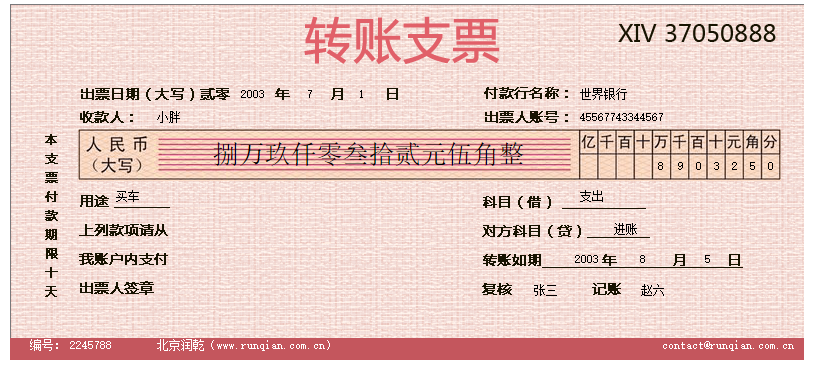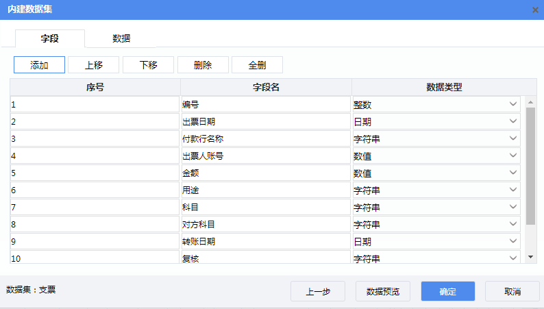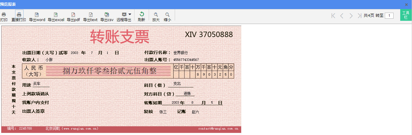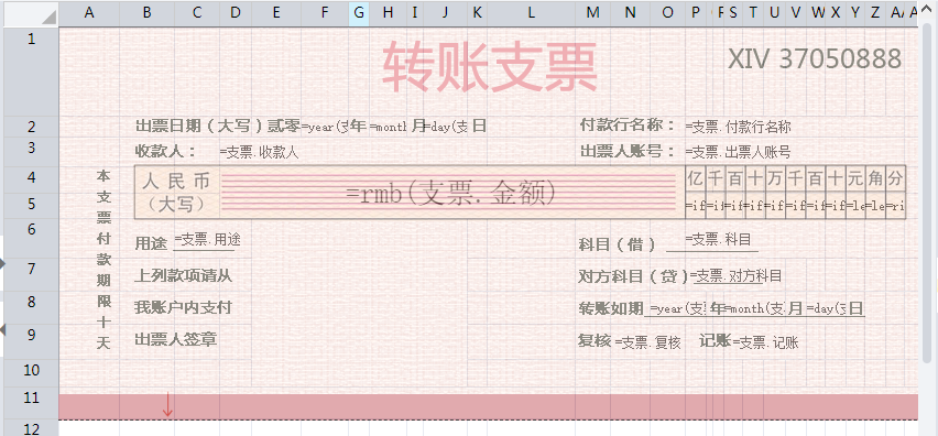 设置单元格表达式: F2:=year(支票.出票日期) H2:=month(支票.出票日期) J2:=day(支票.出票日期) P2:=支票.付款行名称 D3:=支票.收款人 P3:=支票.出票人账号 D4:=rmb(支票.金额) P5:=if(len(str(支票.金额))>11,left(right(str(支票.金额),12),1),"") Q5:=if(len(str(支票.金额))>10,left(right(str(支票.金额),11),1),"") S5:=if(len(str(支票.金额))>9,left(right(str(支票.金额),10),1),"") T5:=if(len(str(支票.金额))>8,left(right(str(支票.金额),9),1),"") U5:=if(len(str(支票.金额))>7,left(right(str(支票.金额),8),1),"") V5:=if(len(str(支票.金额))>6,left(right(str(支票.金额),7),1),"") W5:=if(len(str(支票.金额))>5,left(right(str(支票.金额),6),1),"") X5:=if(len(str(支票.金额))>4,left(right(str(支票.金额),5),1),"") Y5:=left(right(str(支票.金额),4),1) Z5:=left(right(str(支票.金额),2),1) AA5:=right(str(支票.金额),1) C6:=支票.用途 P6:=支票.科目 P7:=支票.对方科目 O8:=year(支票.转账日期) S8:=month(支票.转账日期) W8:=day(支票.转账日期) N9:=支票.复核 S9:=支票.记账