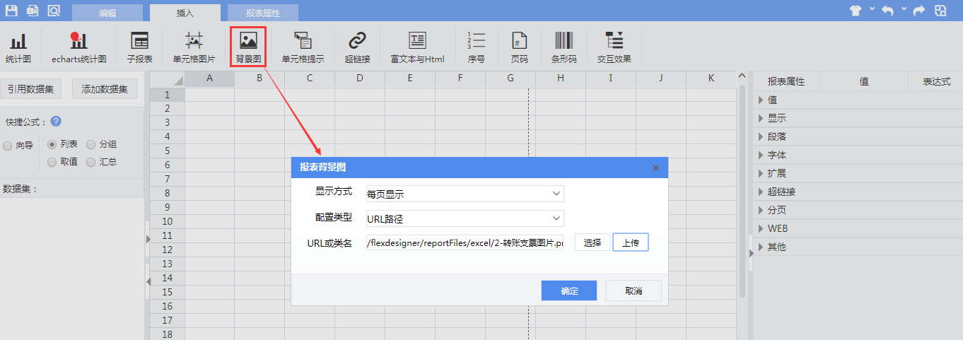 新建复杂报表,利用设计器工具栏中的【插入】--【背景图】对报表进行背景图的插入。