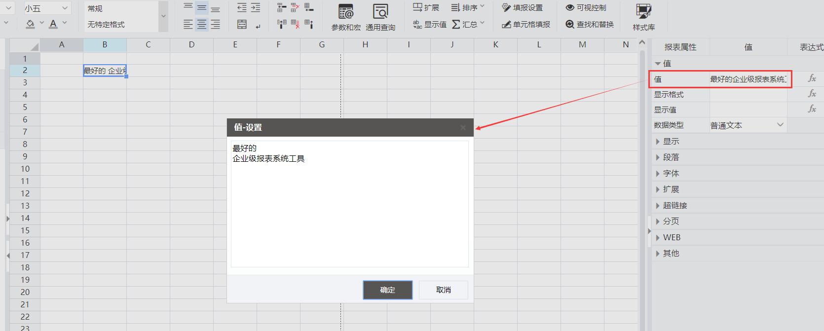 或者双击右侧属性栏【值】选项的输入框,也可以点右键编辑,在弹出的文本输入框里按Enter直接换行。
