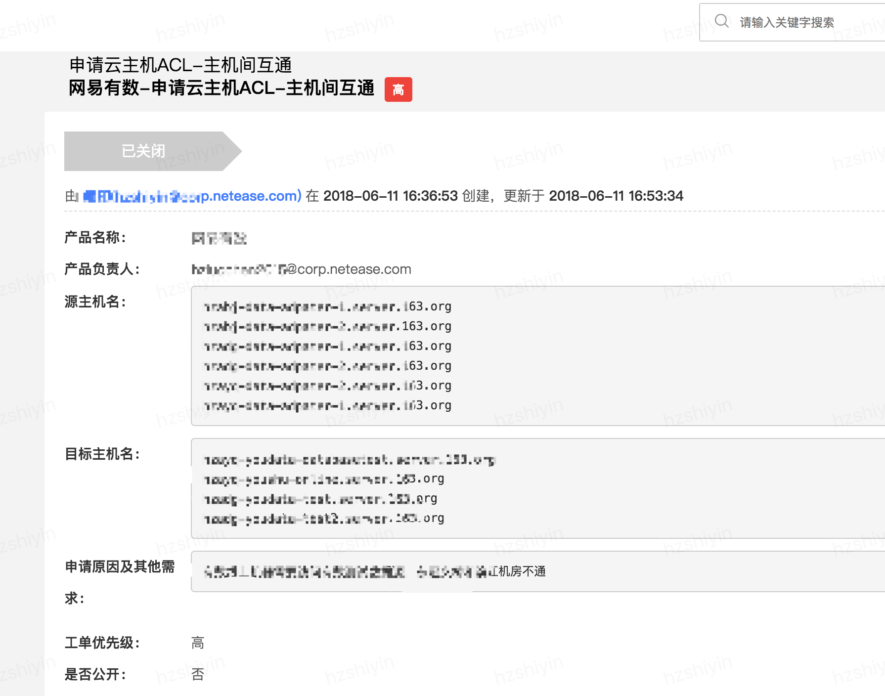 新建工单=>服务器类=>申请云主机ACL=>主机间互通,创建完成之后的工单标题是:"新建工单-申请云主机ACL-主机间互通"
