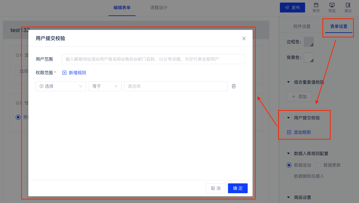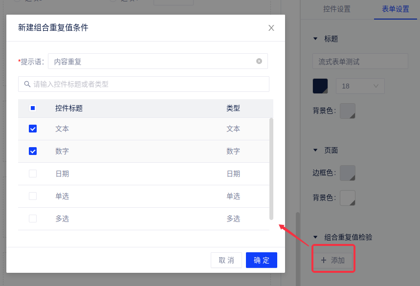 在表单设置处可以对表单标题和页面的样式进行设置,并添加组合重复值校验。
