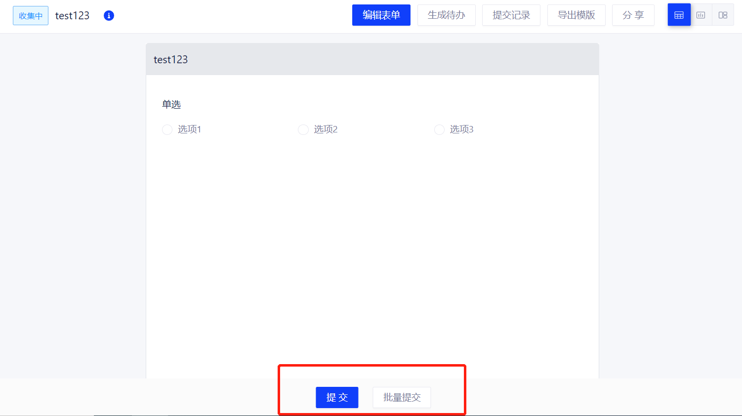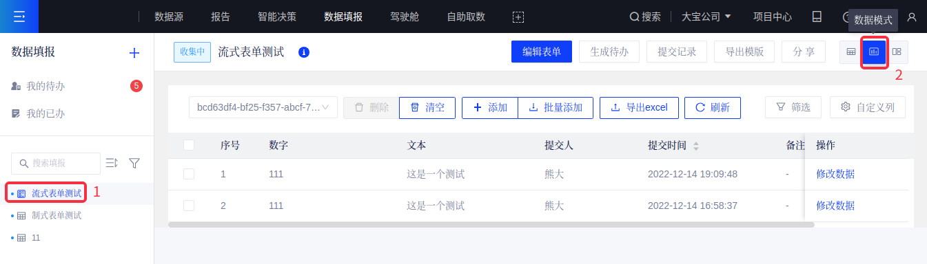 • 数据模式:用户可以以数据列表的形式看到已填报数据,且可以修改数据和批量提交数据