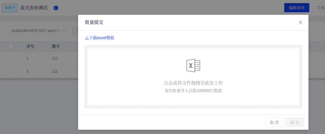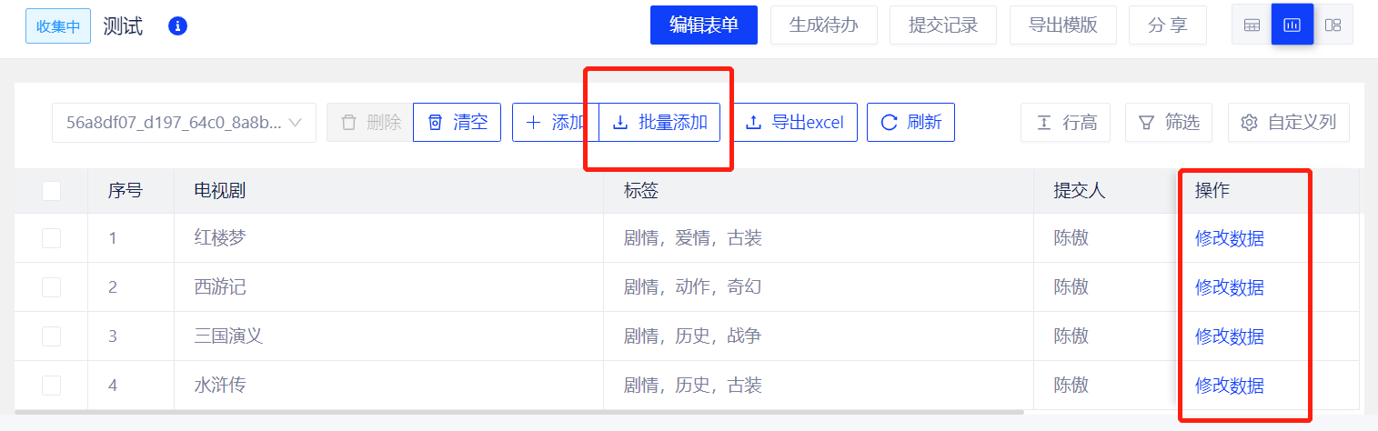 • 批量添加:点击“批量添加”可以批量导入数据,相当于批量提交数据