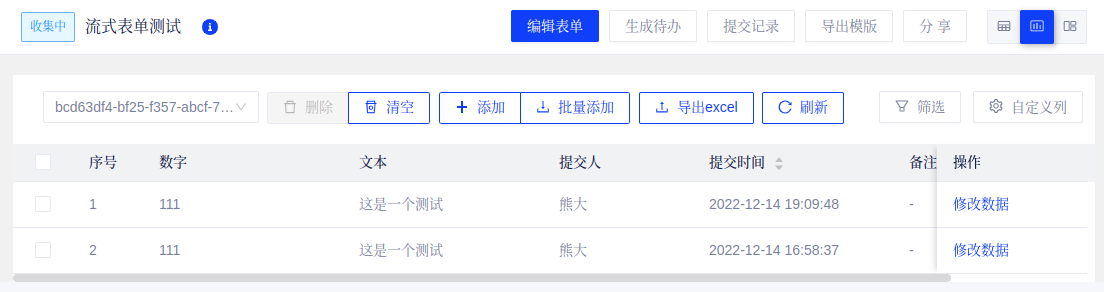 选中表单后,点击[数据模式]即可进入数据管理界面,如下图所示: