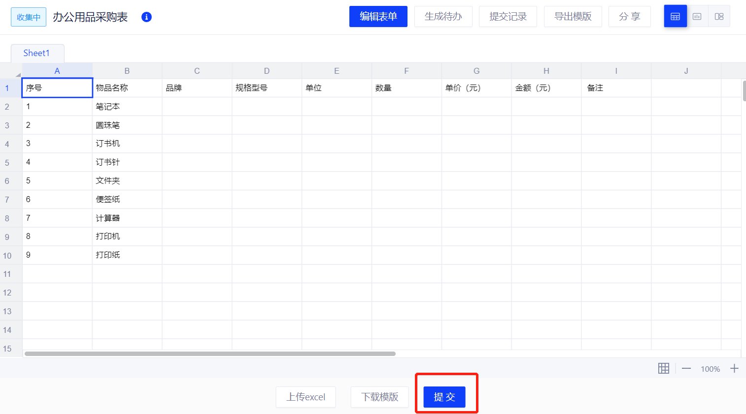 • 模板模式:用户可以查看报表样式,进行表单样式校验,以便进行模板下载和数据批量上传操作