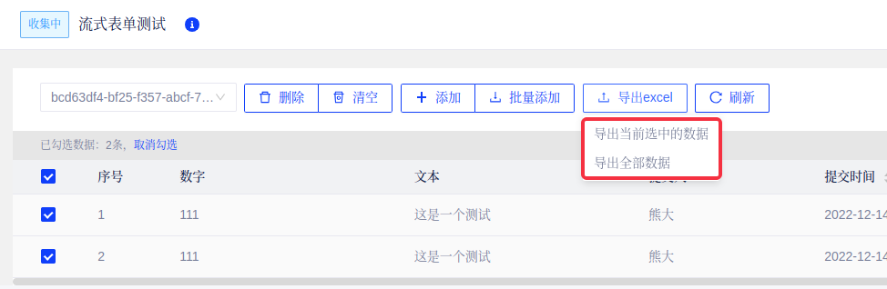 • 导出excel:导出excel中可以将数据以表头名为各列列名,导出成为excel文件,支持大数据量的导出