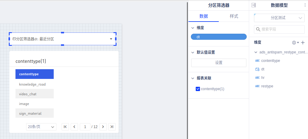 (3)分区筛选器作用于报告时,模型中没有隐藏的分区字段,生成的图表默认带上该分区字段的分区筛选器并默认选择最近分区(若模型隐藏分区字段,则不会在报告上加筛选器):