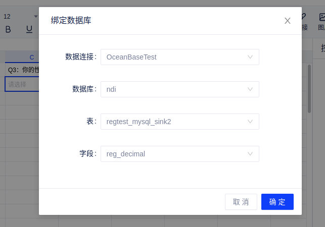 绑定数据库:在下拉列表中点击“绑定数据库”时,选择项目、数据连接、表、字段,可实现将业务数据库中的字段选项直接设置为选项。