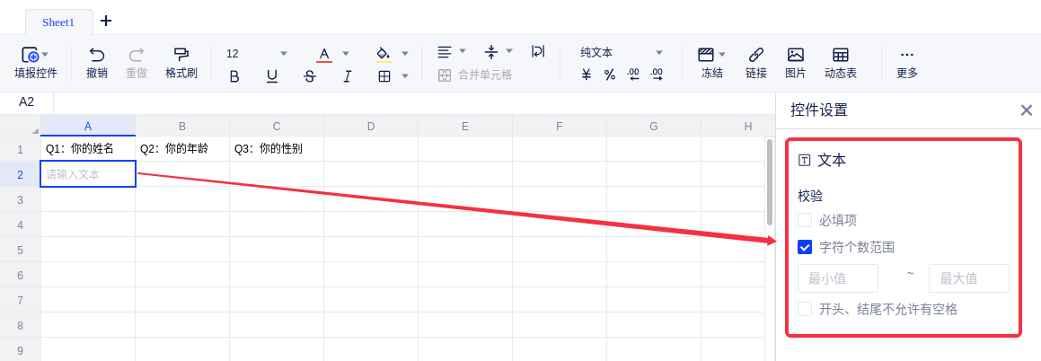 如果您需要搜集字符类型的数据时可选用“文本”控件,然后在控件配置区可以设置校验。