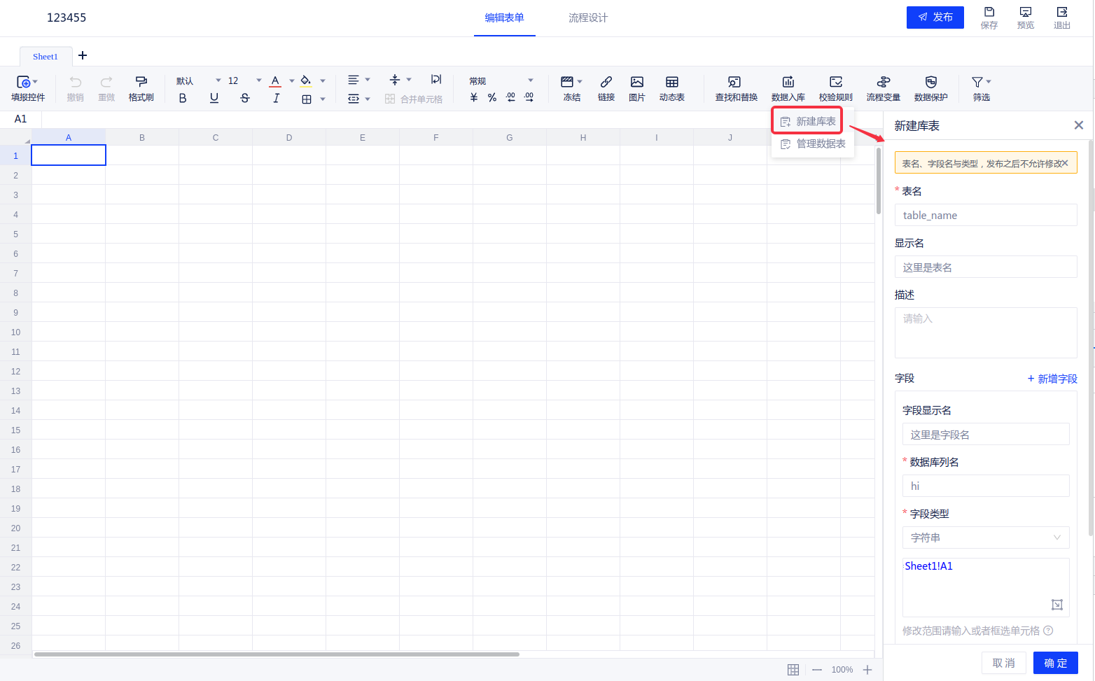 (1)在表单编辑页面,点击[数据入库-新建库表],即可新建一张该填报的写入表。