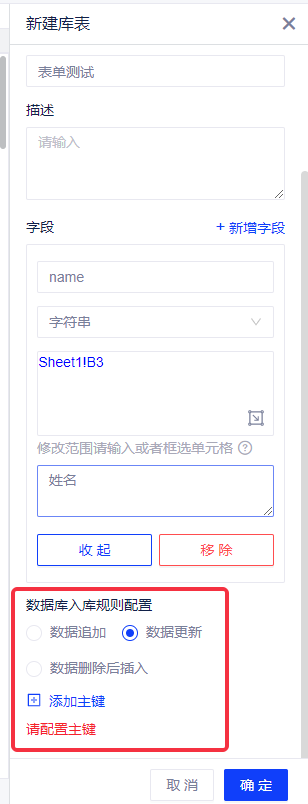 (2)数据库入库规则配置:目前支持3种入库规则:数据追加、数据更新和数据删除后插入。