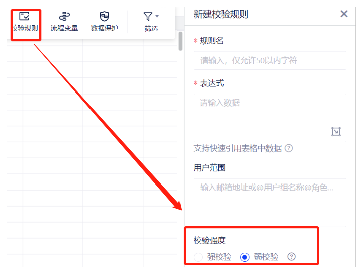 • 强校验:数据未通过校验条件时,用户无法提交表单